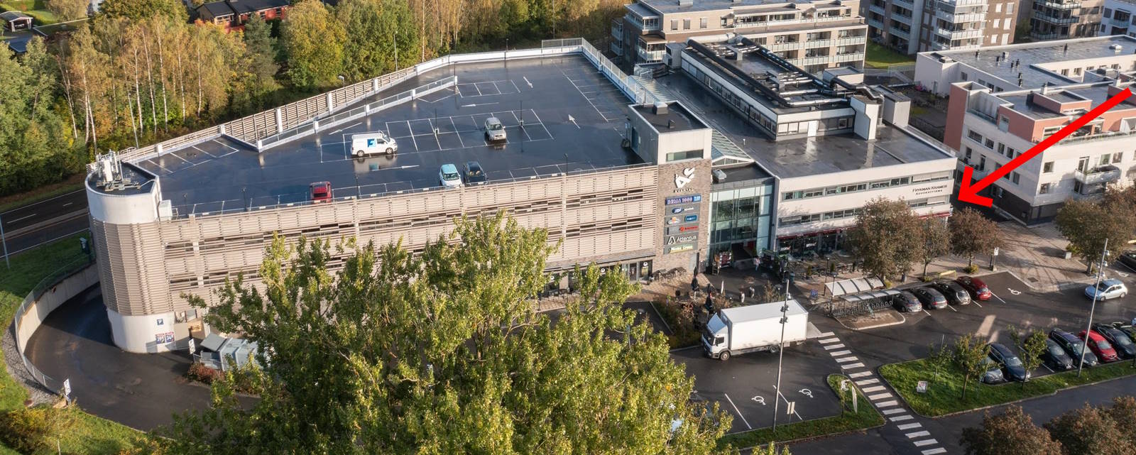 Ås Sentrum Minilager ligger i underetasjen i Ås Kvartal, med inngang fra siden der den røde pilen viser. Adressen er Rådshusplassen 29, 1430 Ås.